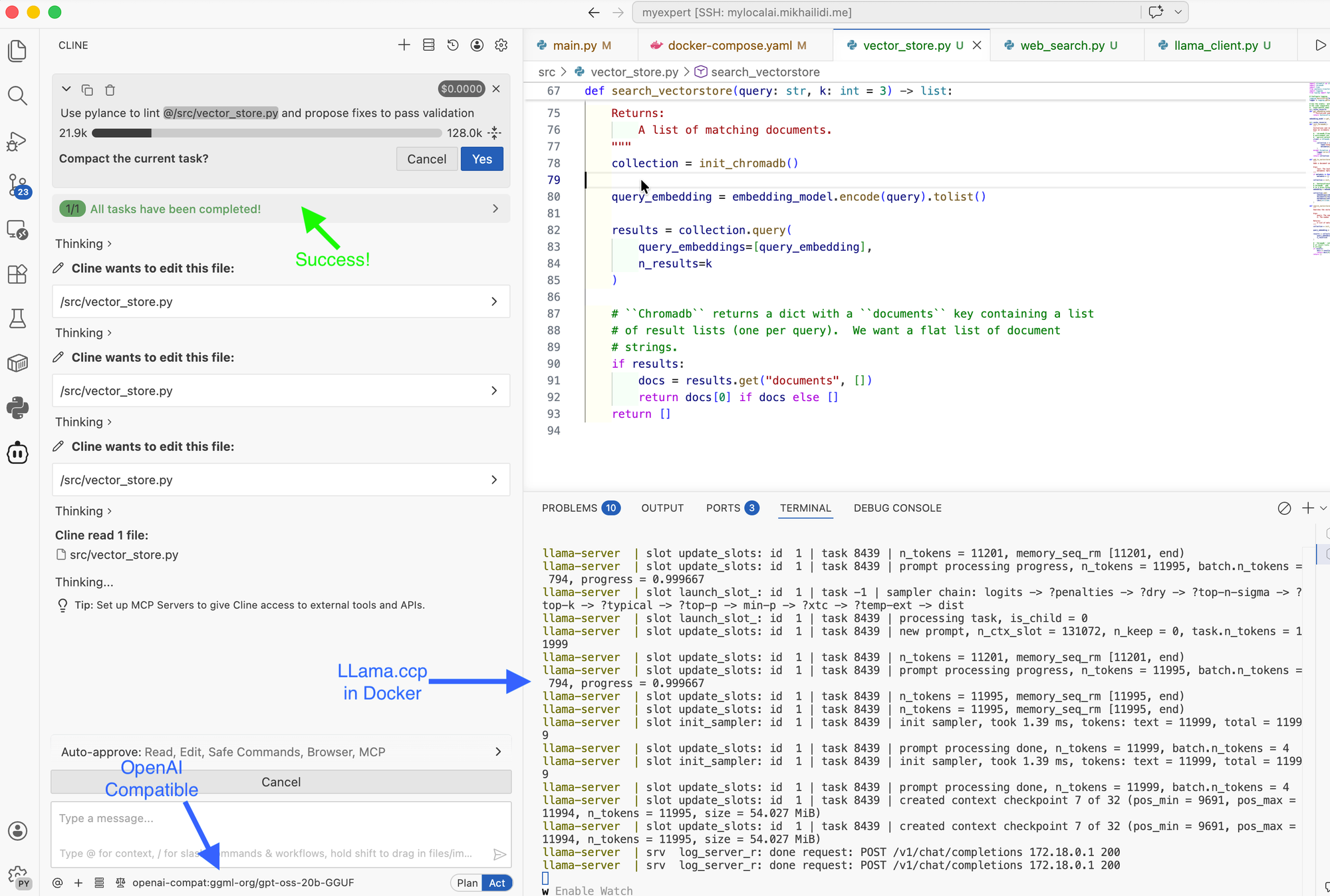 Keeping playing with local models and surrounding services, I replaced the original Ollama service with its lean and fast relative - Llama.cpp. The transition didn't sit well with the VS Code Cline plugin, so I had to conduct some research and make a few changes.