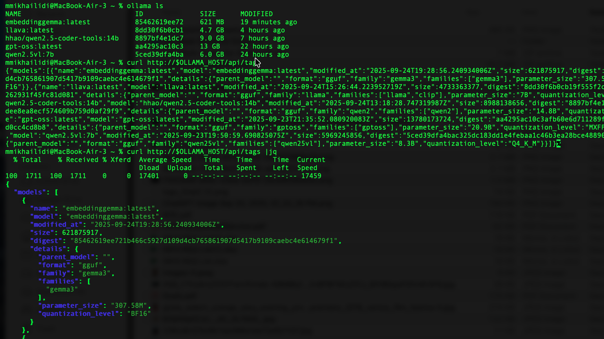 Same output, but using the curl command. Service /api/tags returns all local models. Running the reply through the jq gives you a formatted JSON response.