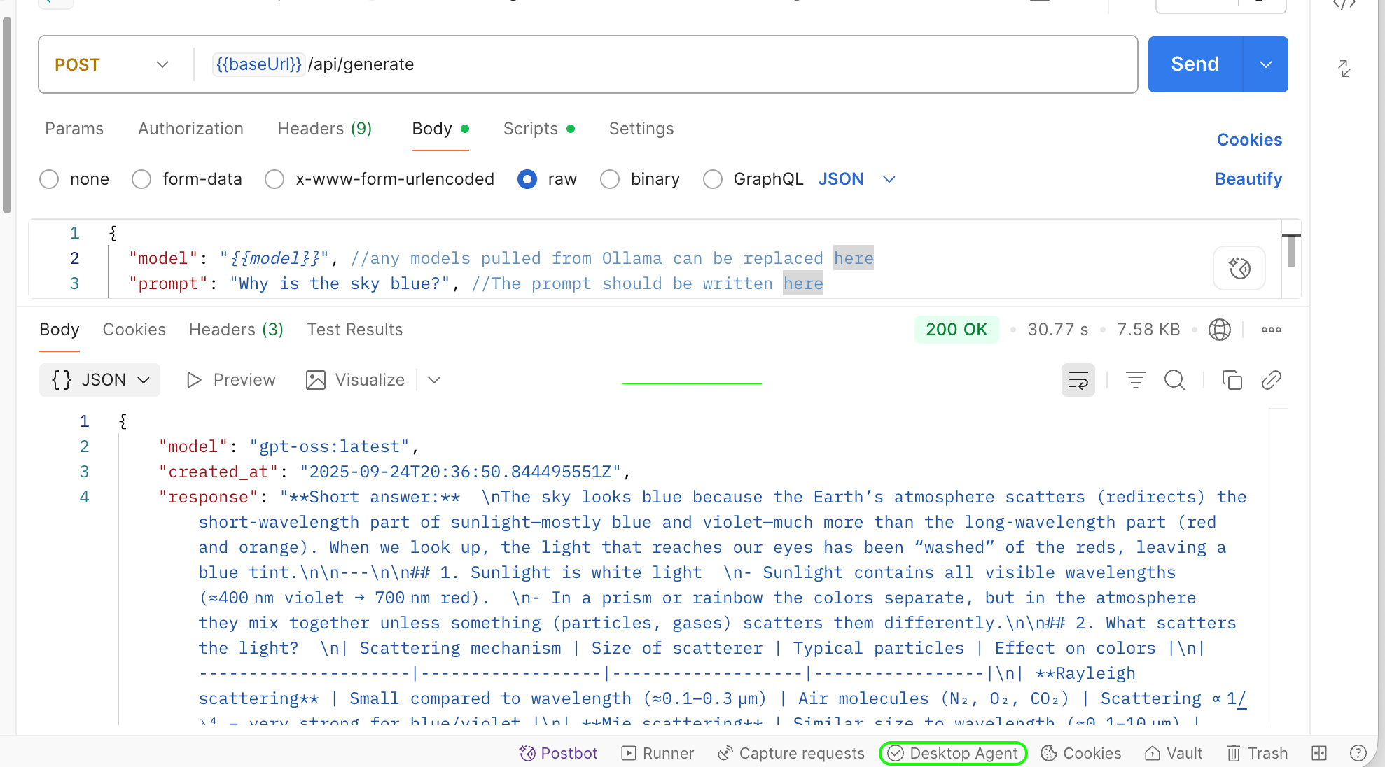 To learn about model capabilities and master API usage, I recommend starting with the Postman Ollama REST API project. Fork it to your account and make the necessary adjustments. Your cloned project has two variables: {{baseURL}} and {{model}}. Set them to the appropriate values and run a request. As expected, the request will fail, although Postman does its best to route your requests. Unfortunately, you may need either a desktop application or a Postman Agent. With the Postman Agent up and running, the standard Web application automatically detects the agent's presence and reroutes all API calls through your local network.