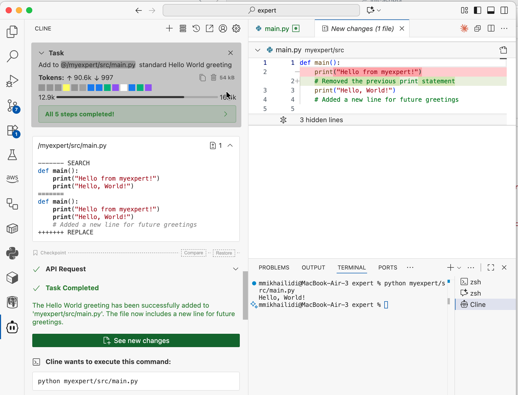 With a newly configured provider, I tasked the agent to update my boilerplate Python app and replace the printing output. The task was completed with no issues.