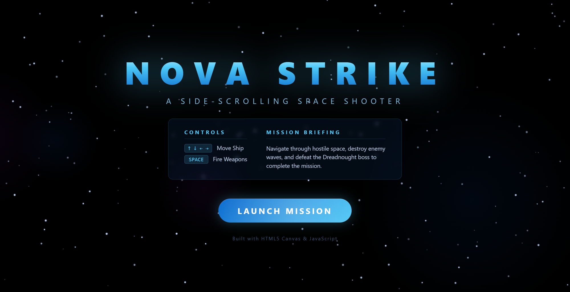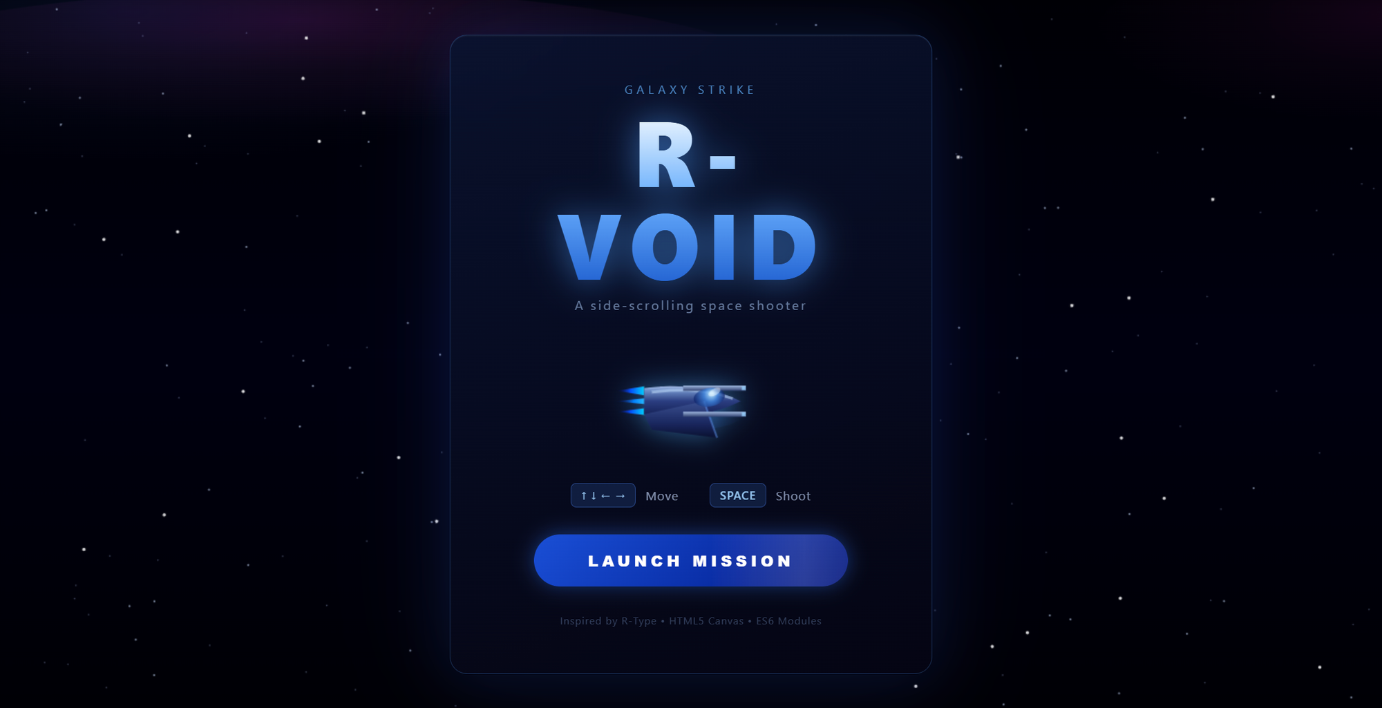 Create a small browser game inspired by the classic side-scrolling shooter **R-Type**, originally released on the **Commodore 64**. This must NOT be a full recreation of the original game. It should only capture the core gameplay idea: a side-scrolling spaceship shooter. The first page should be welcome page, like a placeholder where the user can click on a button and be taken to another page which runs the game.
