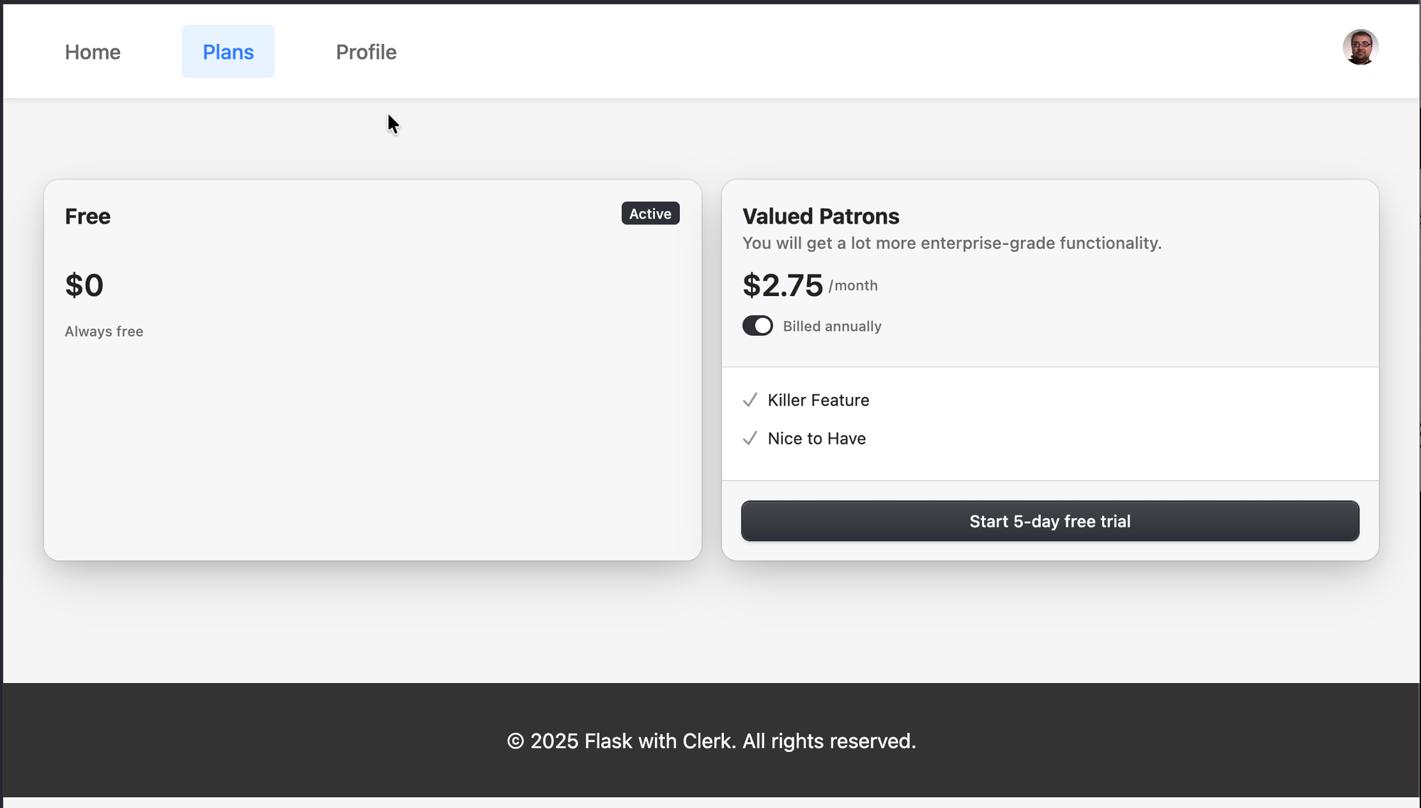 Save the changes, restart the application, and test your new, protected application with subscription plans. You could always find the source code for the demo project in the Flask with Clerk example repository.